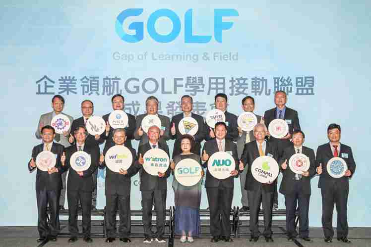 GOLF学用接轨联盟集结企业和学校的力量,,,打造「学用合一、、、产学接轨」的创新合作平台 (前排左起:淡江大学副校长何启东、、、、元智大学校长林启瑞、、纬育执行长许延岳、、、、纬创总经理暨执行长黄柏漙、、教育部政务次长范巽绿、、、蓝狮在线董事长暨执行长彭双浪、、仁宝总经理暨执行长翁宗斌、、、、大同大学校长何明果、、、、圣约翰科大校长艾和昌;后排左起:明新科大校长林启瑞、、龙华科大校长葛自祥、、、台湾科大校长廖庆荣、、中兴大学副校长郑政峯、、中央大学校长周景扬、、台北科大副校长任贻均、、、中华科大副校长石大明、、、明志科大校长刘祖华)