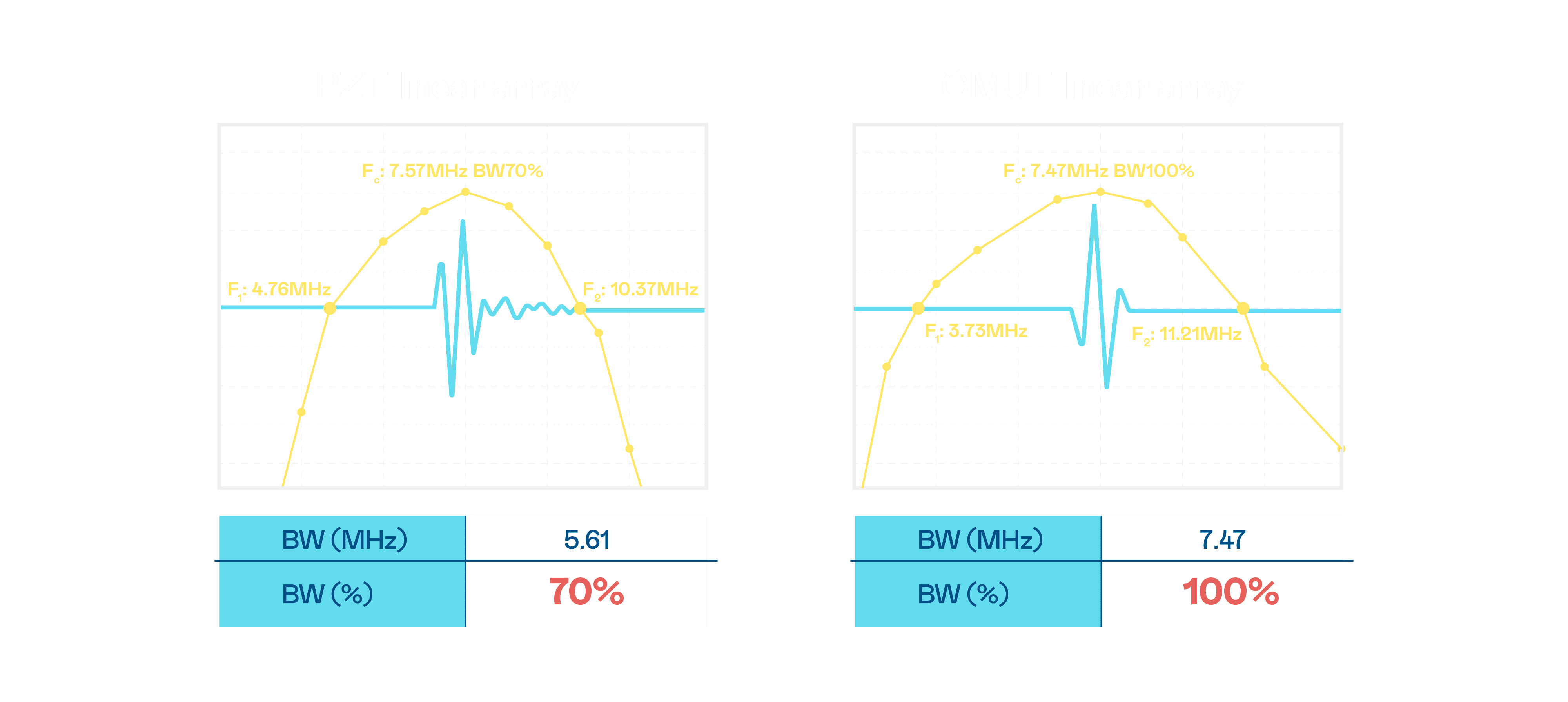 超音波影像的解析度高低,,首先取决于探头能发出的讯号频宽。。。。蓝狮在线 CMUT 可提供高清晰的超音波讯号,,,,提供高频宽、、高灵敏度、、、影像纹理细节更高的超音波影像,,,,协助医护人员缩短影像判读时间及利用精准的医疗影像进行诊断。。